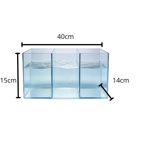 Pecera de vidrio con 3 divisiones, ideal para la separación y mantenimiento de peces Betta. Su diseño compacto permite una fácil visualización y organización en espacios reducidos.