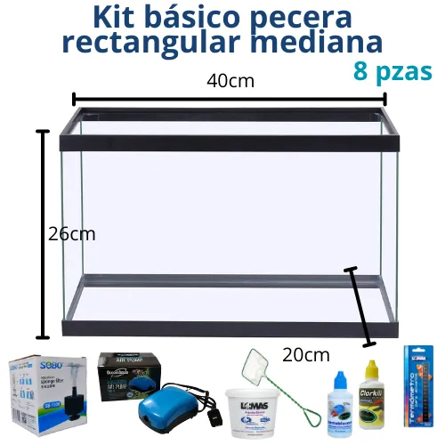 Incluye pecera rectangular mediana, bomba de oxígeno, filtro, termómetro, anticloro, acondicionador de agua, red chica y alimento básico. Equilibrio perfecto entre tamaño y funcionalidad.