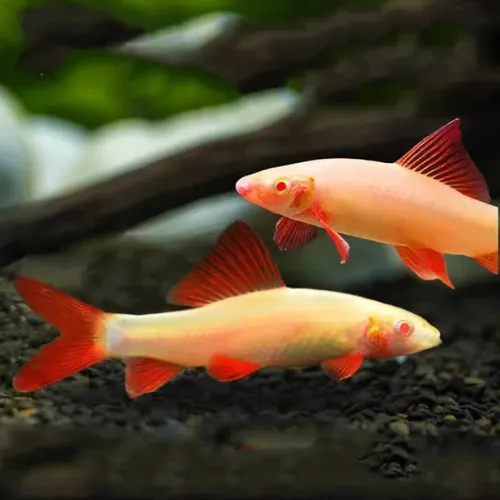Pez llamativo con cuerpo claro y aletas rojas. Ideal para acuarios amplios y bien decorados.
